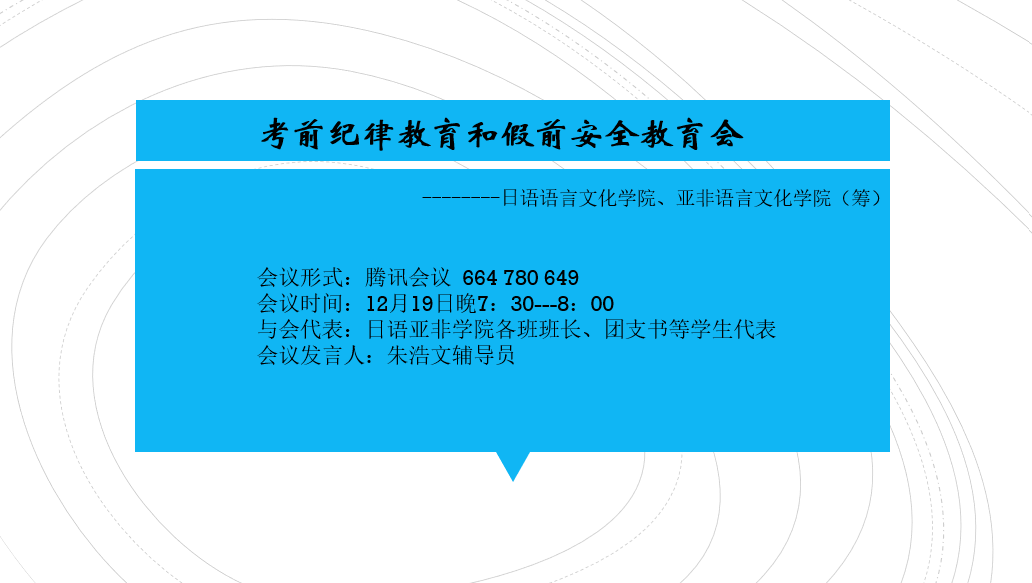 本网讯 12月19日,日语语言文化公司、威廉williamhill体育(筹)考前纪律教育和假前安全教育会顺利召开。本次会议以线上腾讯会议的形式召开,各班班长、团支书等员工代表参与本次会议。公司辅导员朱浩文主持本次会议。