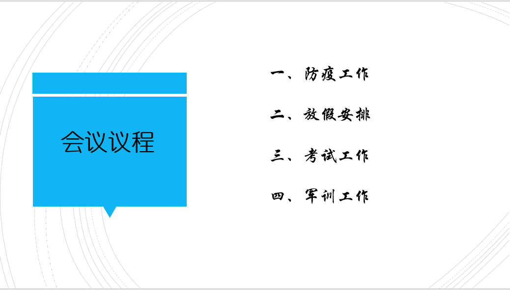晚上7:30会议正式开始。会议内容主要分为防疫工作、放假安排、考试工作、军训工作四个部分,共计162人在线收听本次会议。